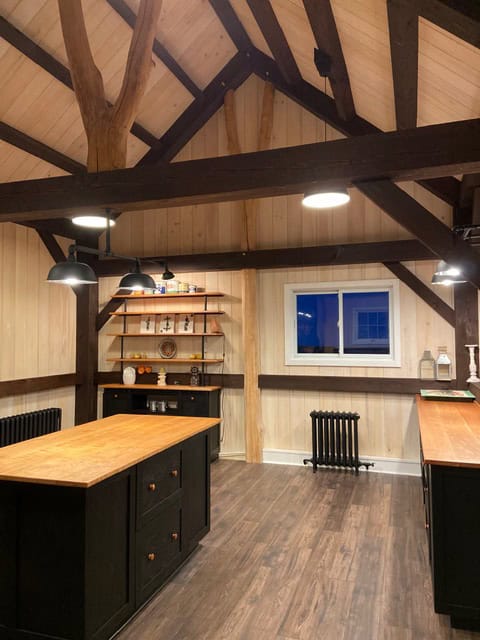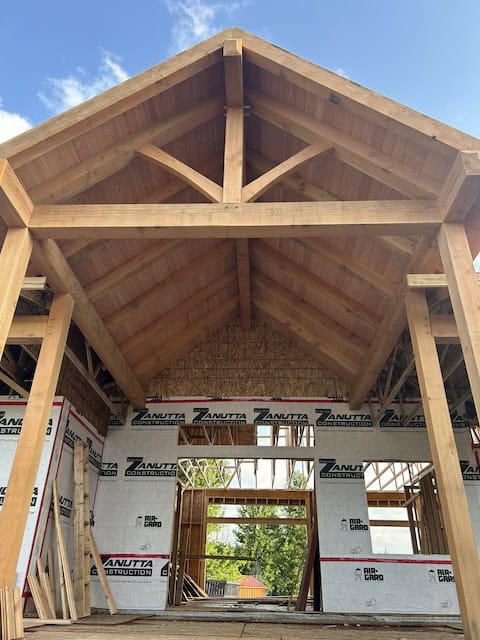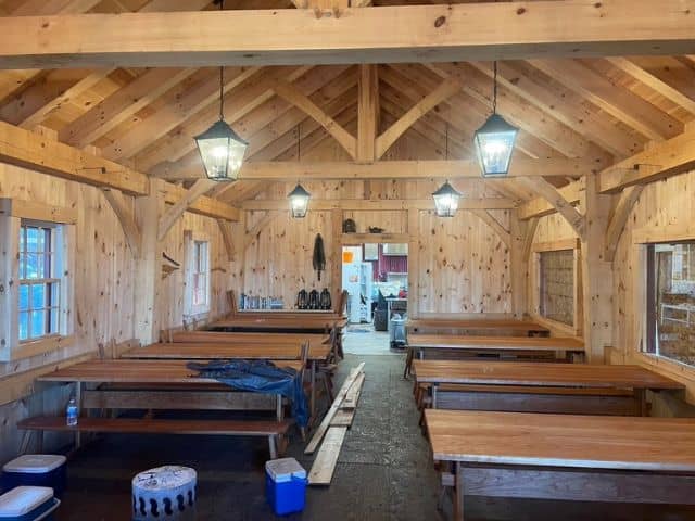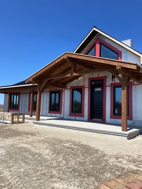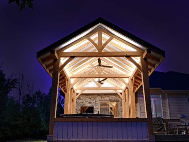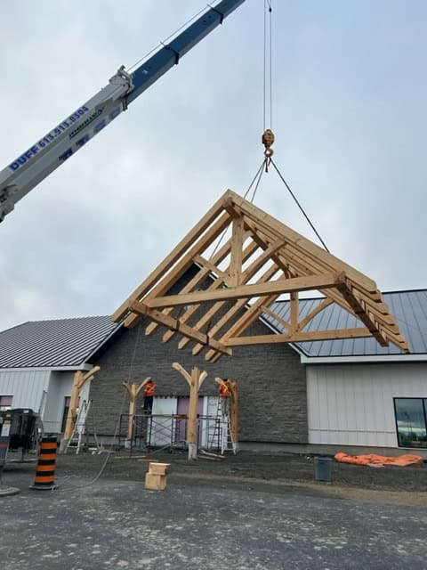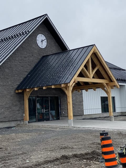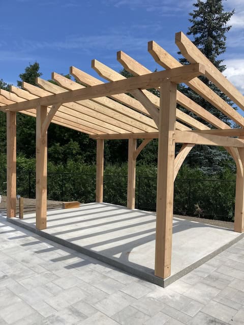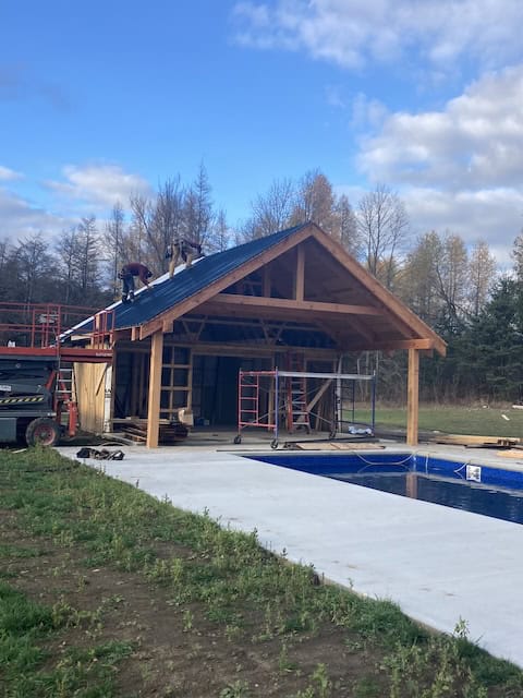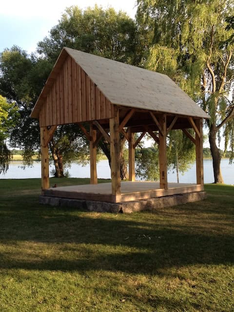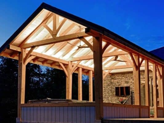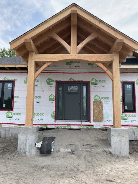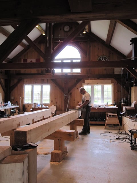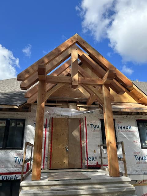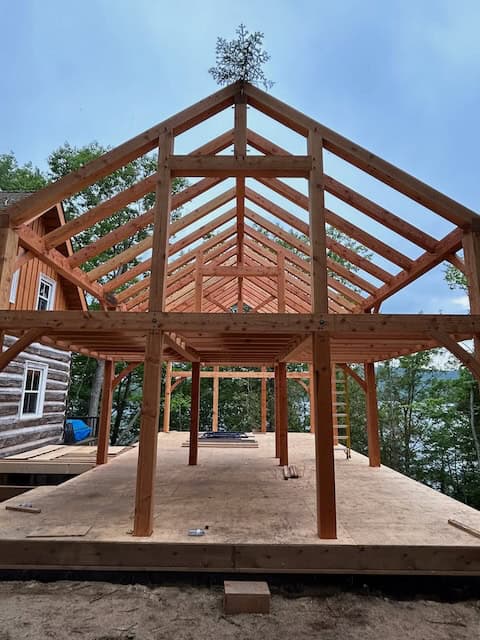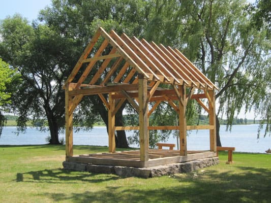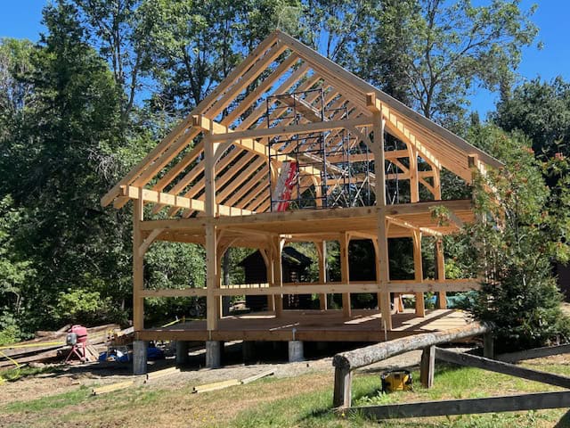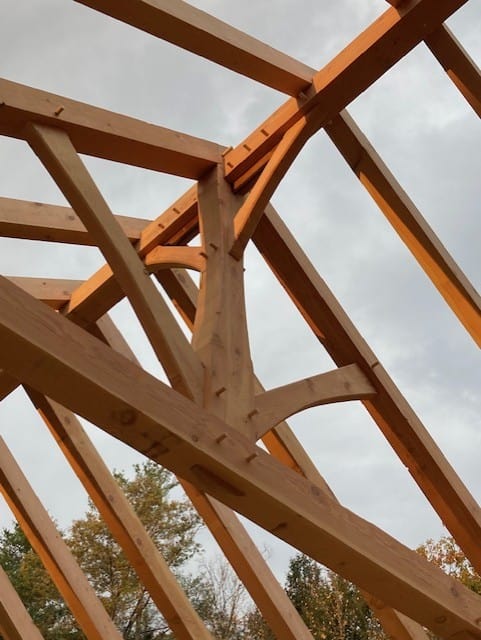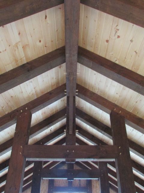 Our design influences are drawn primarily from medieval English and early North American examples. Take a look at the old standing barns that still dot the countryside for examples of this vernacular style, simple rectangles with clean lines and relatively steep roof pitches. Embellished examples of this style could include L-shaped additions, dormers or enclosed entrances. Regardless of add-ons, we believe the best timber frames start out as basic rectangles and evolve from there. Having said that, we are always willing to try new things and can, and have on occasion, incorporated timber framing into more modern design styles. Whether the project is a full house or a gazebo, our design process is to work closely with the client to come up with a design that satisfies the client and the structural integrity of the frame itself. To that end, we offer engineer approved and sealed plans of the frame if requested.